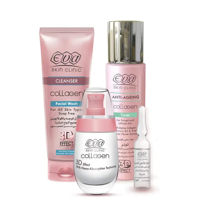 إيڤا سكين كلينك كولاجين كريم للخطوط العميقة +40 - 50 مل + إيڤا سكين كلينك كولاجين غسول للوجه - 150 مل + ايفا سكين كلينيك تونر للبشرة بالكولاجين 200 مل + إيڤا سكين كلينك كولاجين امبولات ( 10 امبولات )