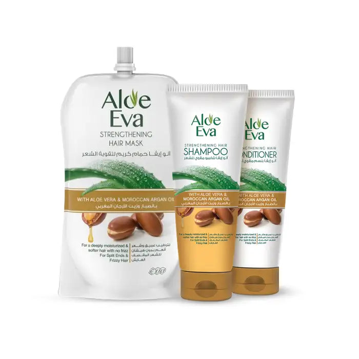 آلو إيڤا شامبو مقوى للشعر بالصبار وزيت الأرجان المغربي 230 مل + آلو إيڤا بلسم مقوى للشعر بالصبار وزيت الأرجان المغربي 230 مل + آلو إيڤا ساشيت حمام كريم لتقويه الشعر بالصبار و زيت الأرجان المغربى 250 جم