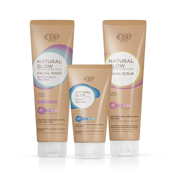 إيڤا سكين كير ﺇشراقة طبيعية غسول الوجه للبشرة العادية إلى الجافة 100 مل + إيڤا سكين كير ﺇشراقة طبيعية مقشر الوجه 100 مل + إيڤا سكين كير ﺇشراقة طبيعية كريم ليلي 50 جم