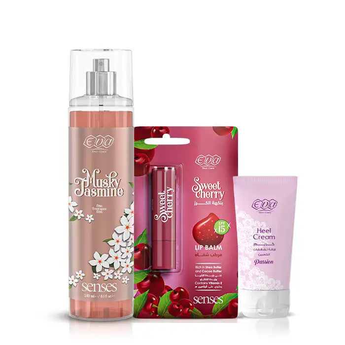 إيڤـا سكين كير سنسيز معطر الجسم 240 مل - ماسكي چاسمين + إيڤا سكين كير سينز مرطب الشفاه بنكهه الكرز 4 جم + إيڤا سكين كير كريم لازاله تشققات الكعبين - باشن 60 مل