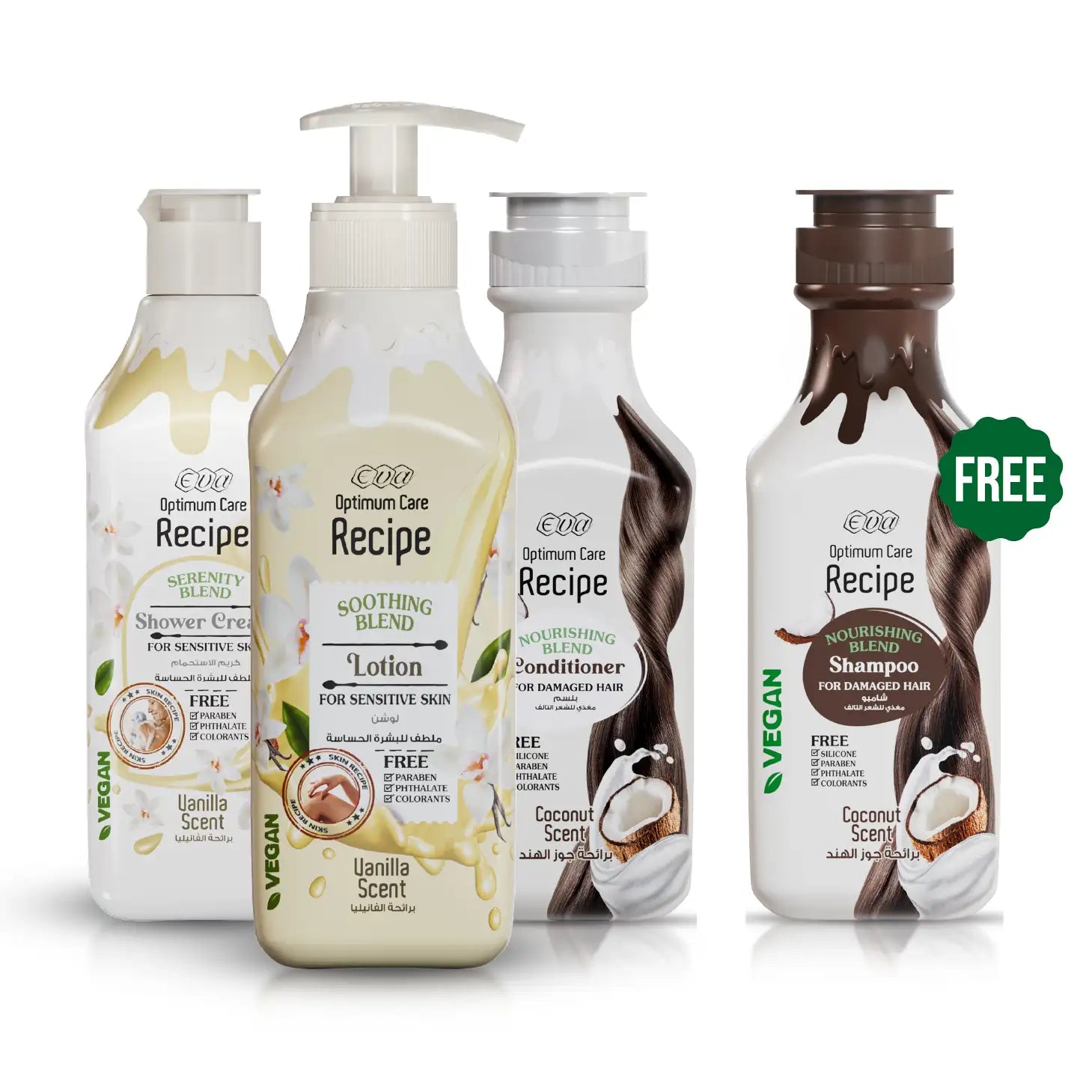 إيڤـا اوپتيموم كير ريسپي لوشن ملطف للبشرة الحساسة - برائحة الڤانيليا 370 مل + إيڤـا اوپتيموم كير ريسپي كريم الاستحمام ملطف للبشرة الحساسة - برائحة الڤانيليا 370 مل + إيڤـا اوپتيموم كير ريسپي نوريشنج بلند بلسم برائحة جوز الهند 350 مل + إيڤـا اوپتيموم كير ريسپي نوريشنج بلند شامبو برائحة جوز الهند 350 مل هدية مجانية