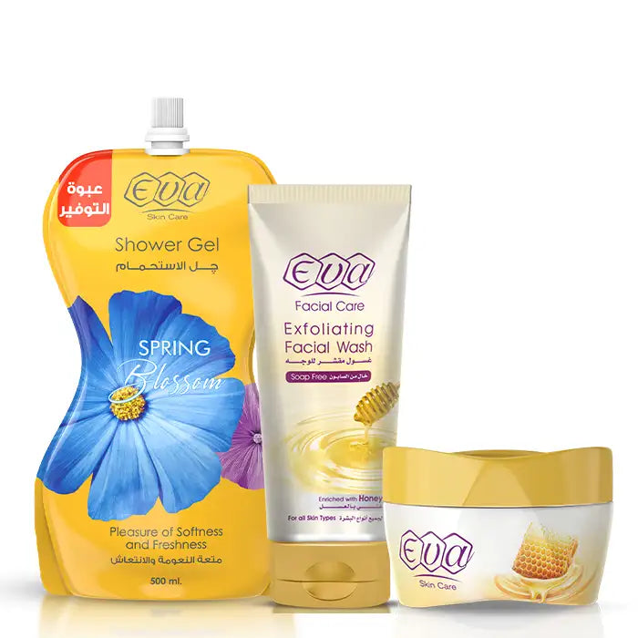 باوتش إيڤا سكين كير جل الأستحمام 500مل SPRING BLOSSOM + إيڤا غسول مقشر للوجه غني بالعسل لكل أنواع البشرة 150 مل + كريم إيڤا بالعسل للبشرة العادية 170 جم