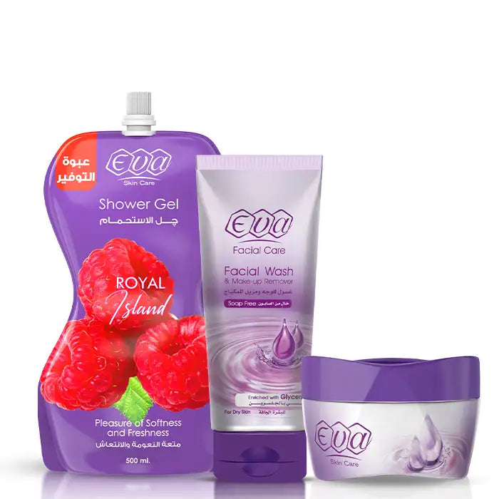 إيڤا سكين كير باوتش جل الأستحمام 500 مل Royal island + إيڤا غسول للوجة ومزيل للمكياج غني بالجلسرين للبشرة الجافة 150 مل + كريم إيڤا بالجلسرين للبشرة الجافة 170 جم