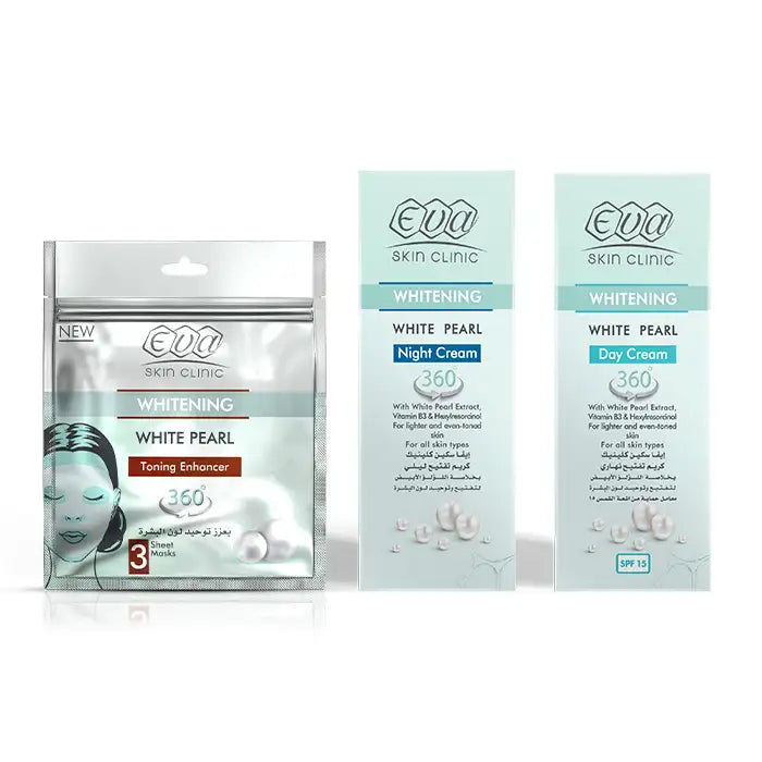 ايفا سكين كلينيك قناع باللؤلؤ الأبيض - 3 شيت فى الساشيت + ايفا سكين كلينيك كريم تفتيح ليلي بخلاصة اللؤلؤ الابيض - 50 مل + ايفا سكين كلينيك كريم تفتيح نهارى بخلاصة اللؤلؤ الابيض بمعامل حماية من اشعة الشمس 15 - 50 مل
