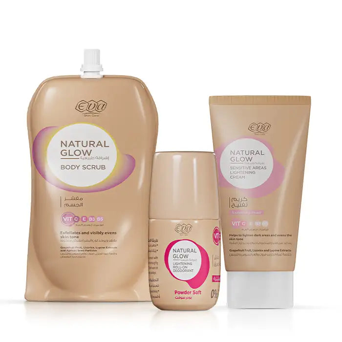 إيڤا سكين كير اشراقه طبيعيه رول اون مزيل لرائحه العرق لتفتيح البشره باودر سوفت 60 جرام + إيڤا سكين كير ﺇشراقة طبيعية كريم تفتيح للمناطق الحساسة 50 جم + إيڤا سكين كير إشراقة طبيعية مقشر الجسم 250 جم