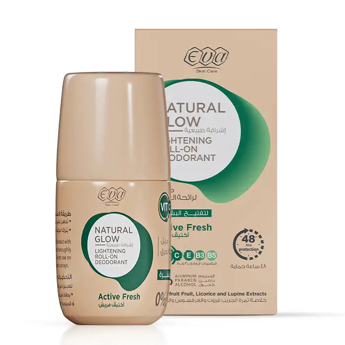 Eva Skin Care Natural Glow Lightening Roll On deodorant advanced formula is enriched with multivitamins and natural ingredients that help to fight odor while also helping lightening and evening the skin tone,thus making the underarm area refreshed and smooth all day long